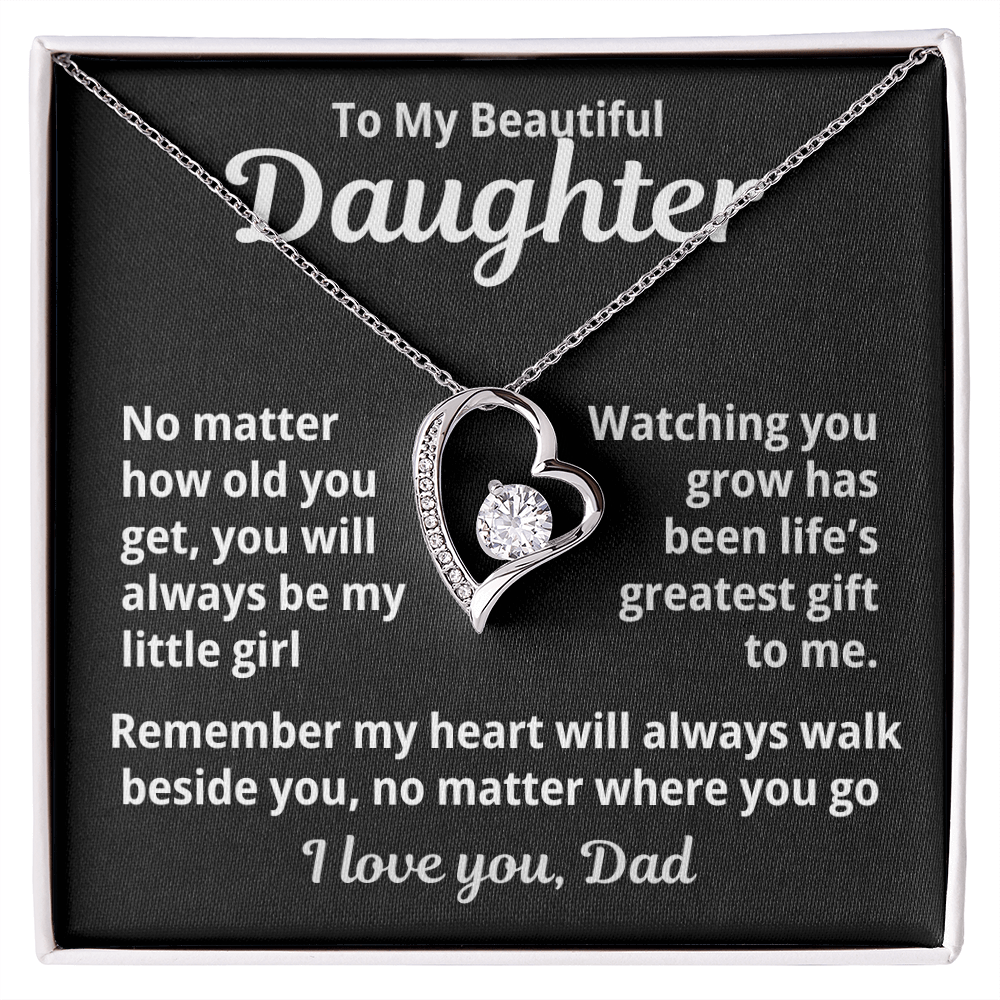 Imagine your daughter’s smile when she opens this beautiful Forever Love Necklace, paired with a heartfelt message card. A gift that creates a memory to last a lifetime and a keepsake she’ll treasure forever.